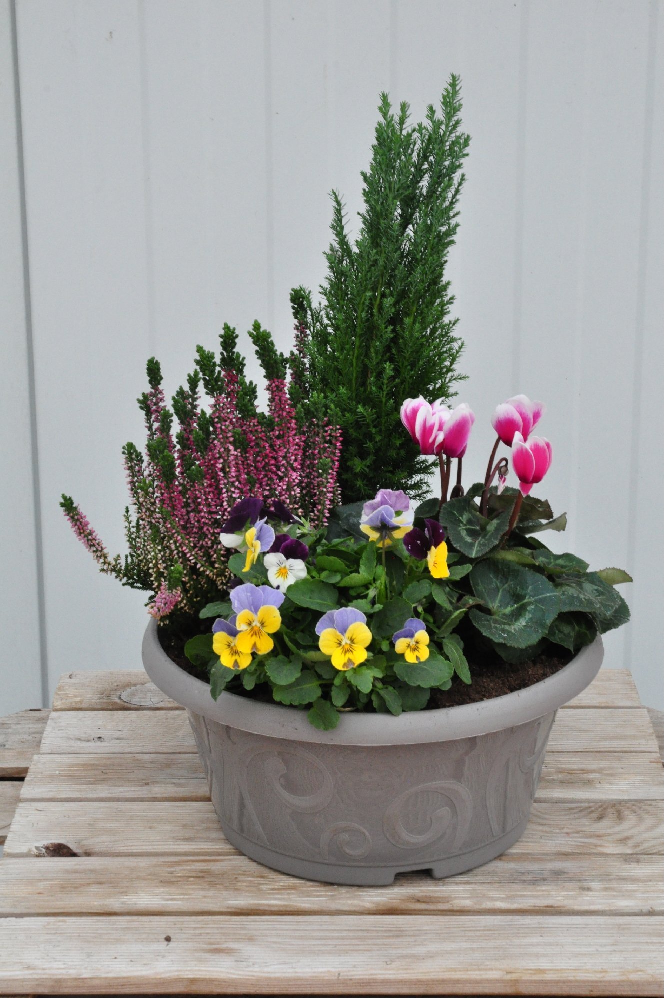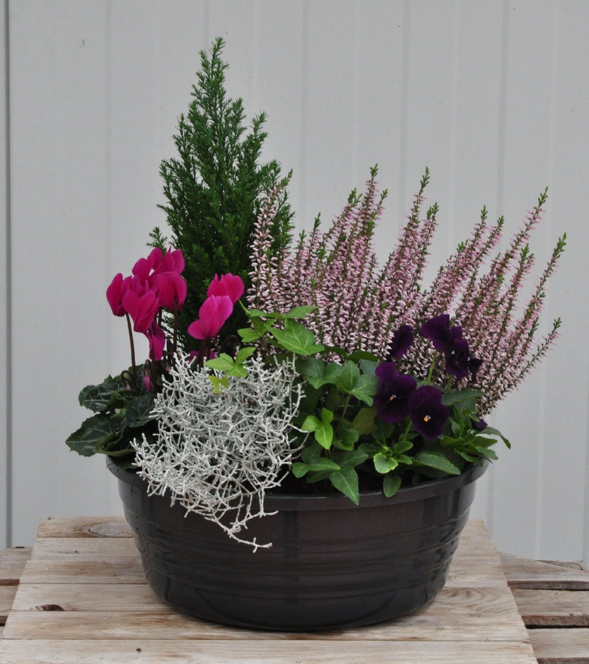 Composition de saison: conifère, mini-cyclamen, pensées, bruyère calluna