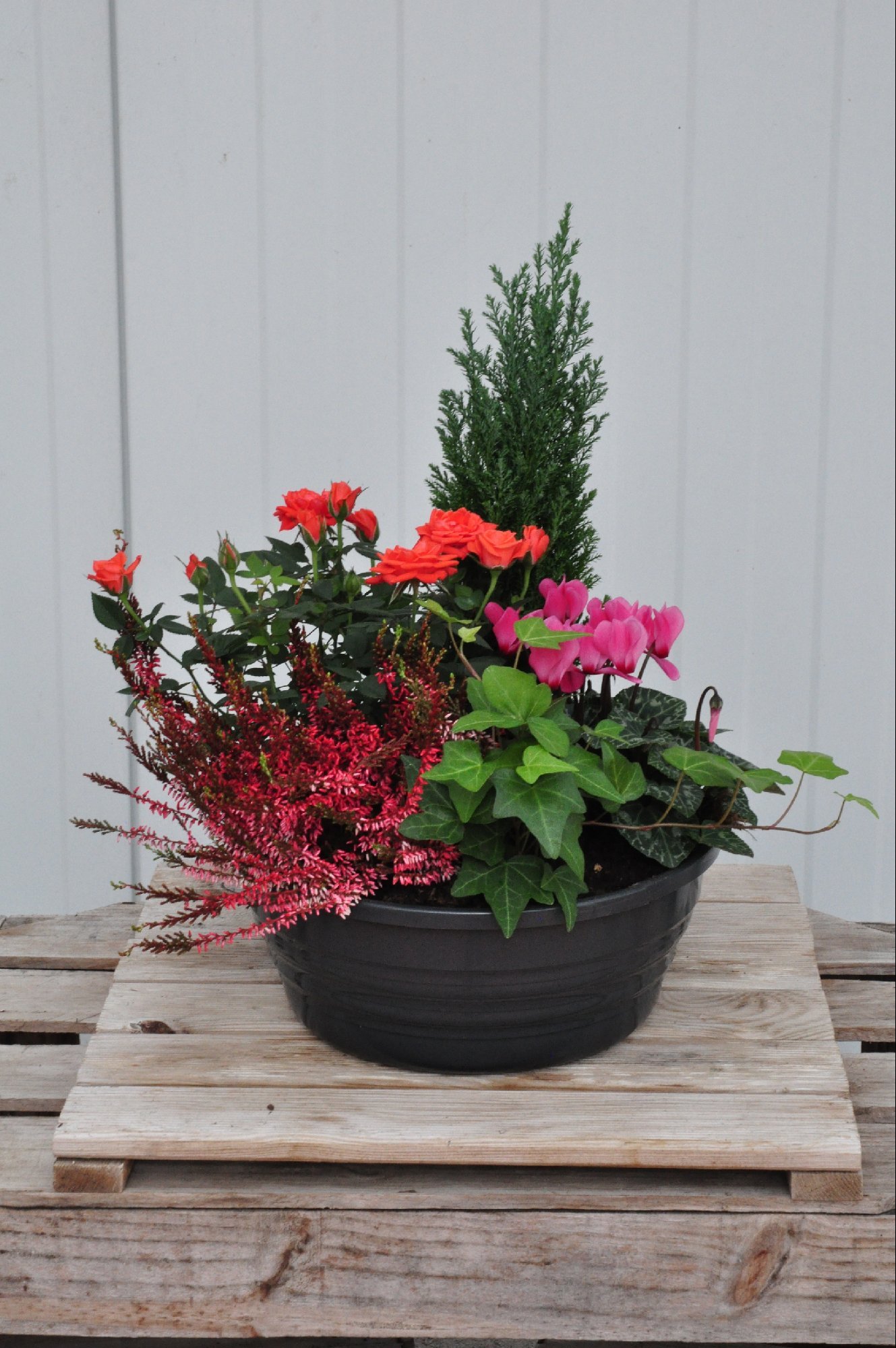 Composition de saison: conifère, mini-cyclamen, lierre, bruyère calluna, rosier