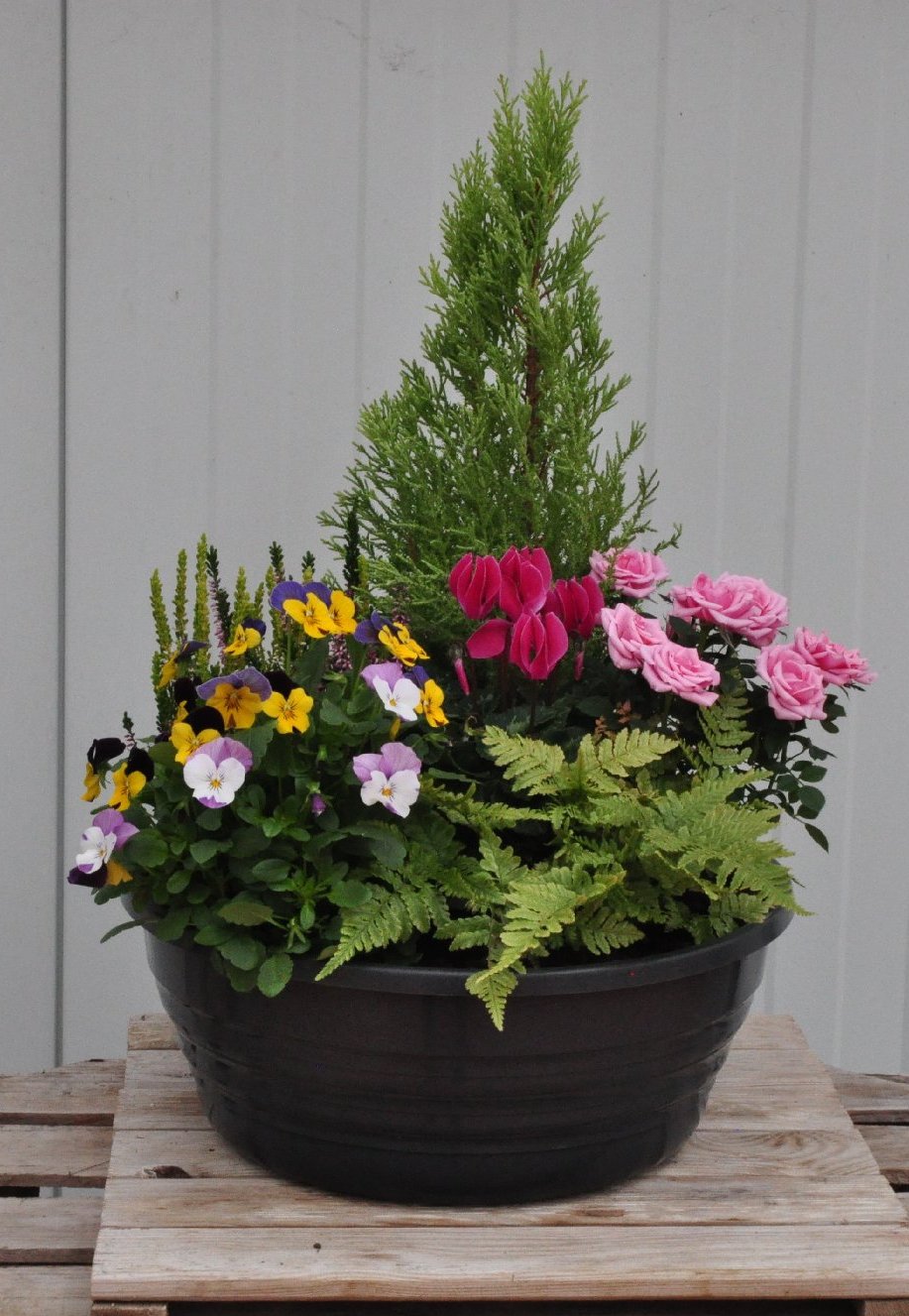 Composition de saison: conifère, mini-cyclamen, pensées, bruyère calluna, rosier, fougère