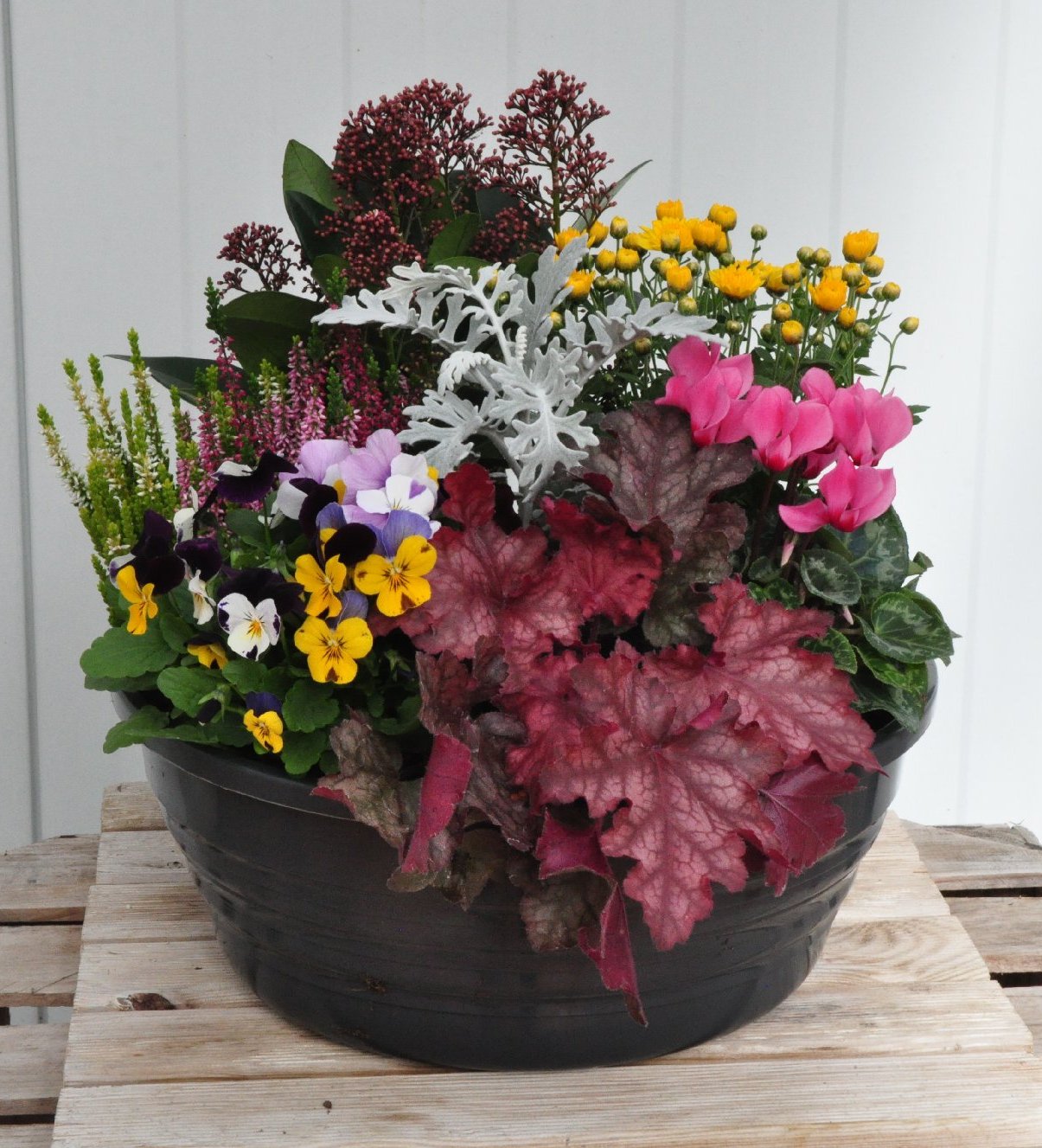 Composition de saison: skimmia, chrysanthème, heuchère, mini-cyclamen, pensées, bruyère calluna, cinéraire